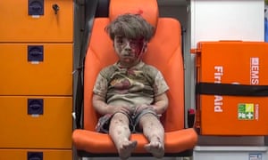 A photograph of a boy sitting dazed and bloodied in the back of an ambulance after surviving a regime airstrike in Aleppo has highlighted the desperation of the Syrian civil war and the struggle for control of the city.